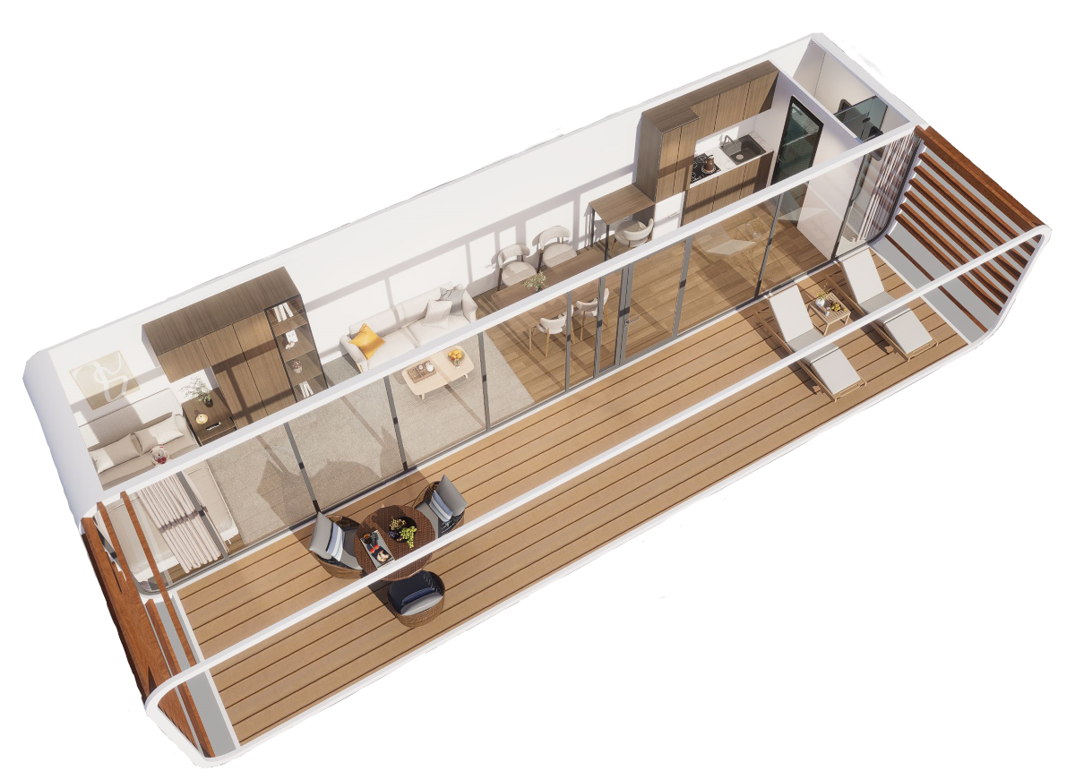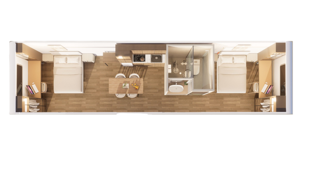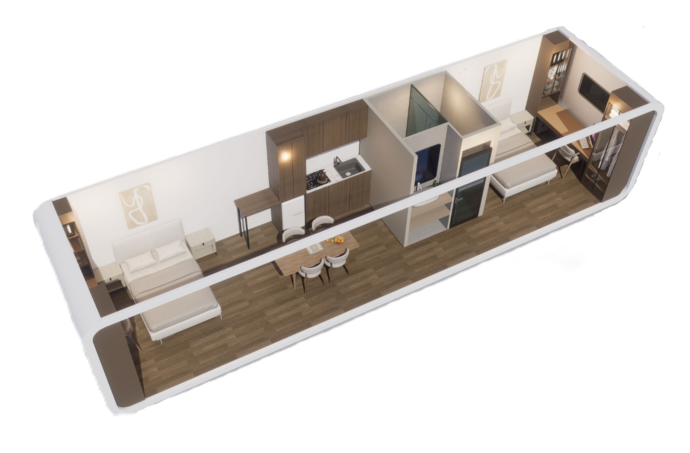 Amazonia Standard Fitout includes a timber bed base with underbed drawers, bedside drawers, wardrobe, fold-down table, kitchenette with two-element cooktop, bathroom with shower and toilet, and vanity with hand basin.