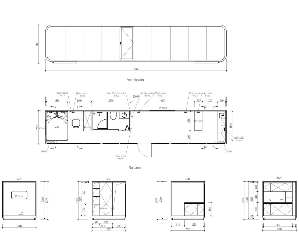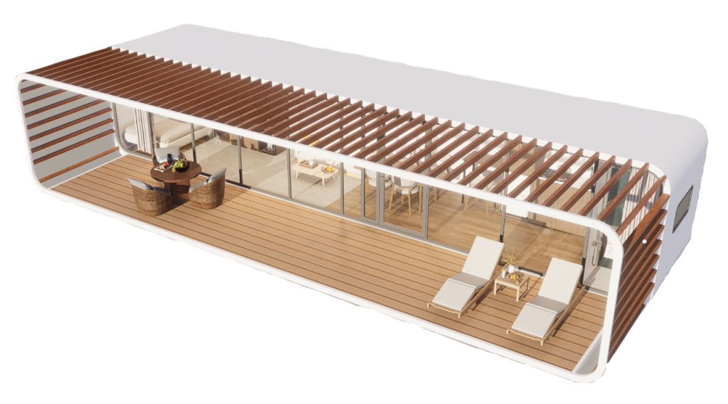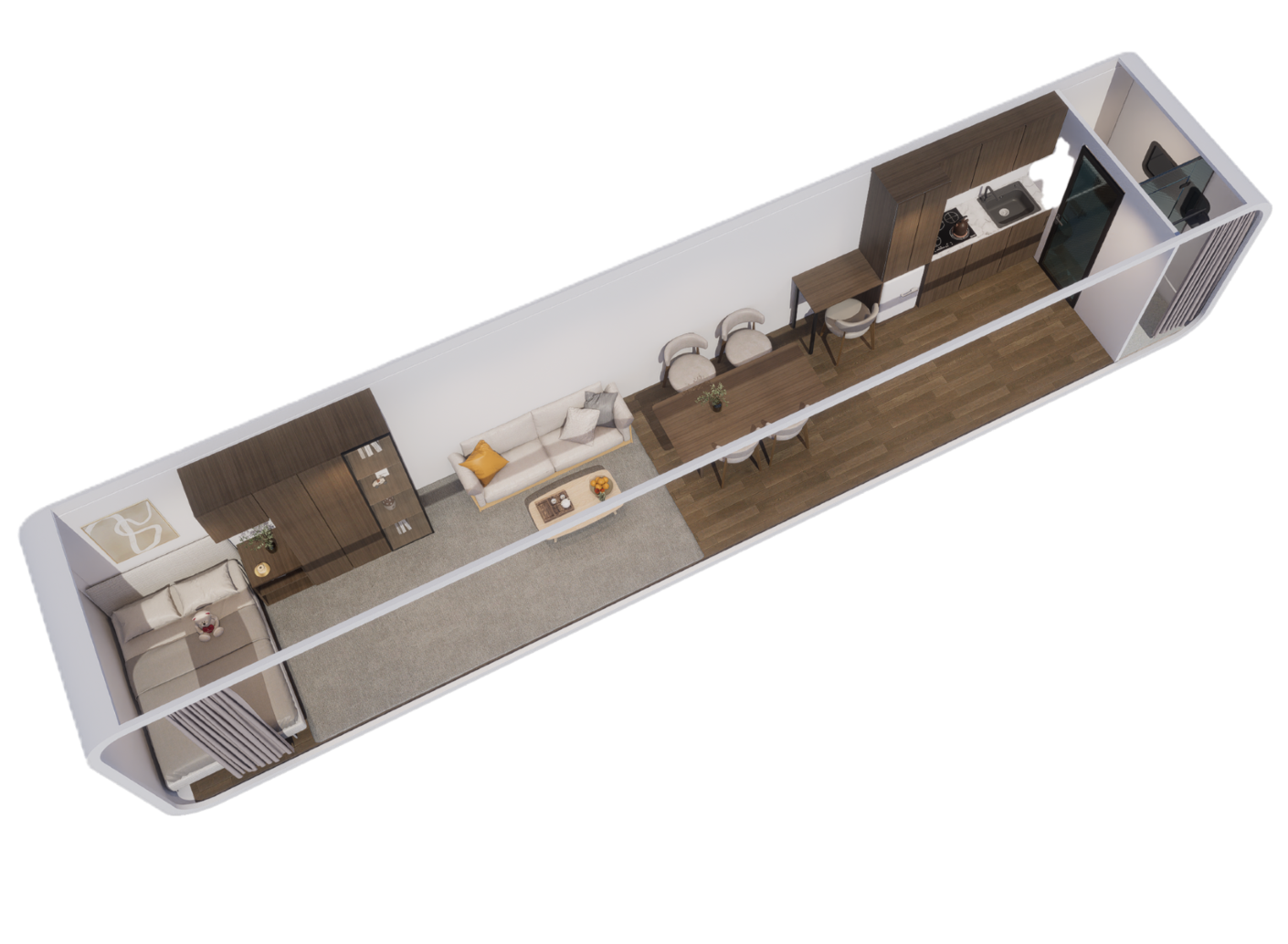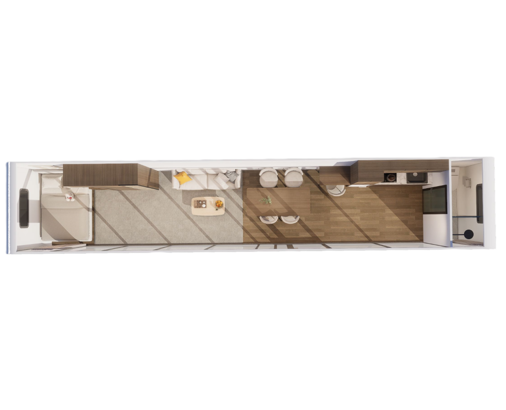 Amazonia Standard Fitout includes a timber bed base with underbed drawers, bedside drawers, wardrobe, fold-down table, kitchenette with two-element cooktop, bathroom with shower and toilet, and vanity with hand basin.
