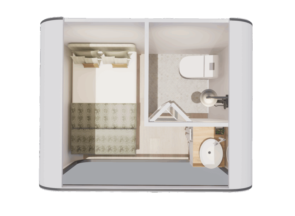 Galapagos Standard Fitout includes a timber bed base with underbed drawers, bathroom with shower and toilet, and vanity with hand basin.