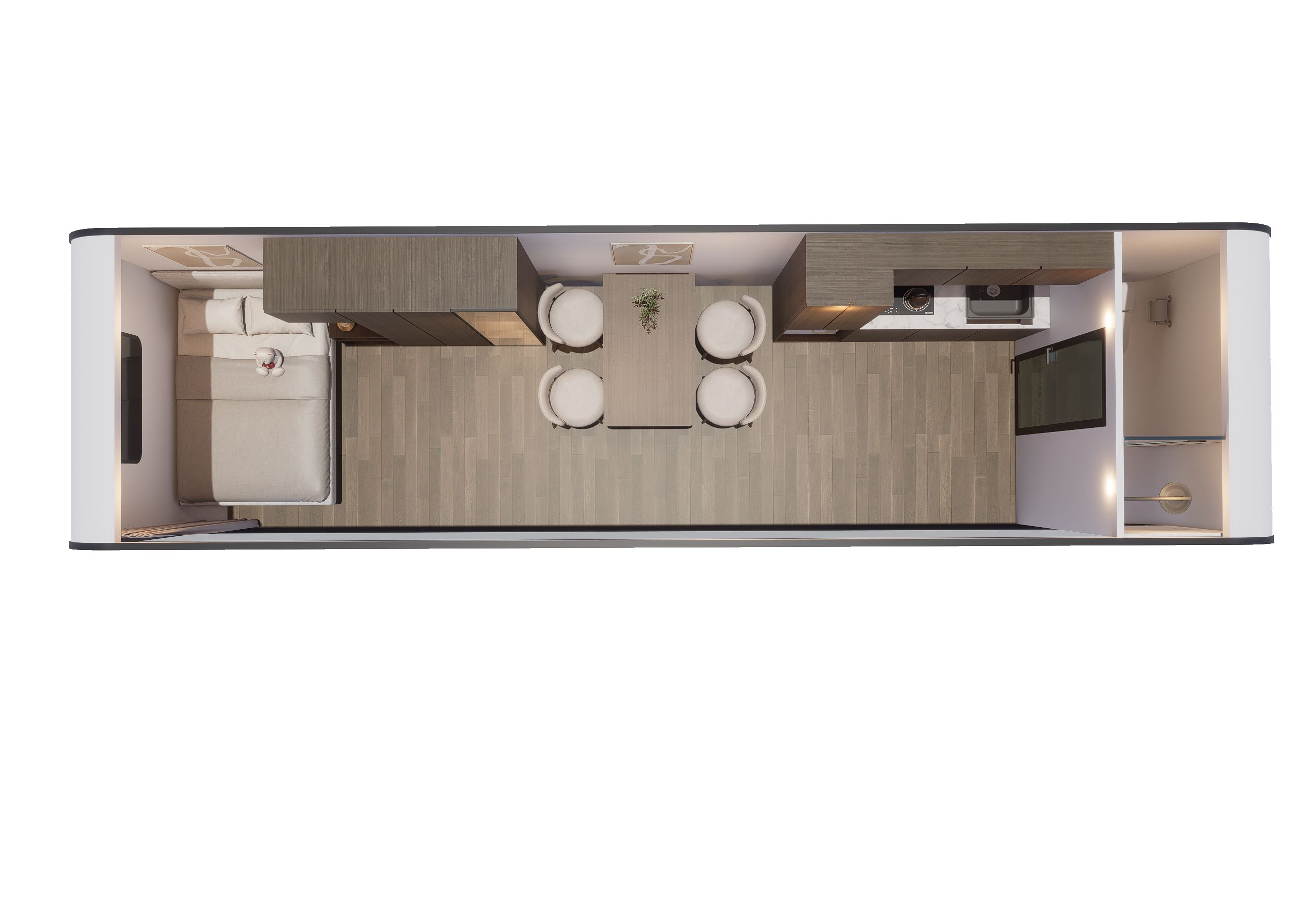 - Exterior shell finished with extremely durable carbon fibre composite panels (or aluminium panels for the Plus models), with XPS insulation layer between